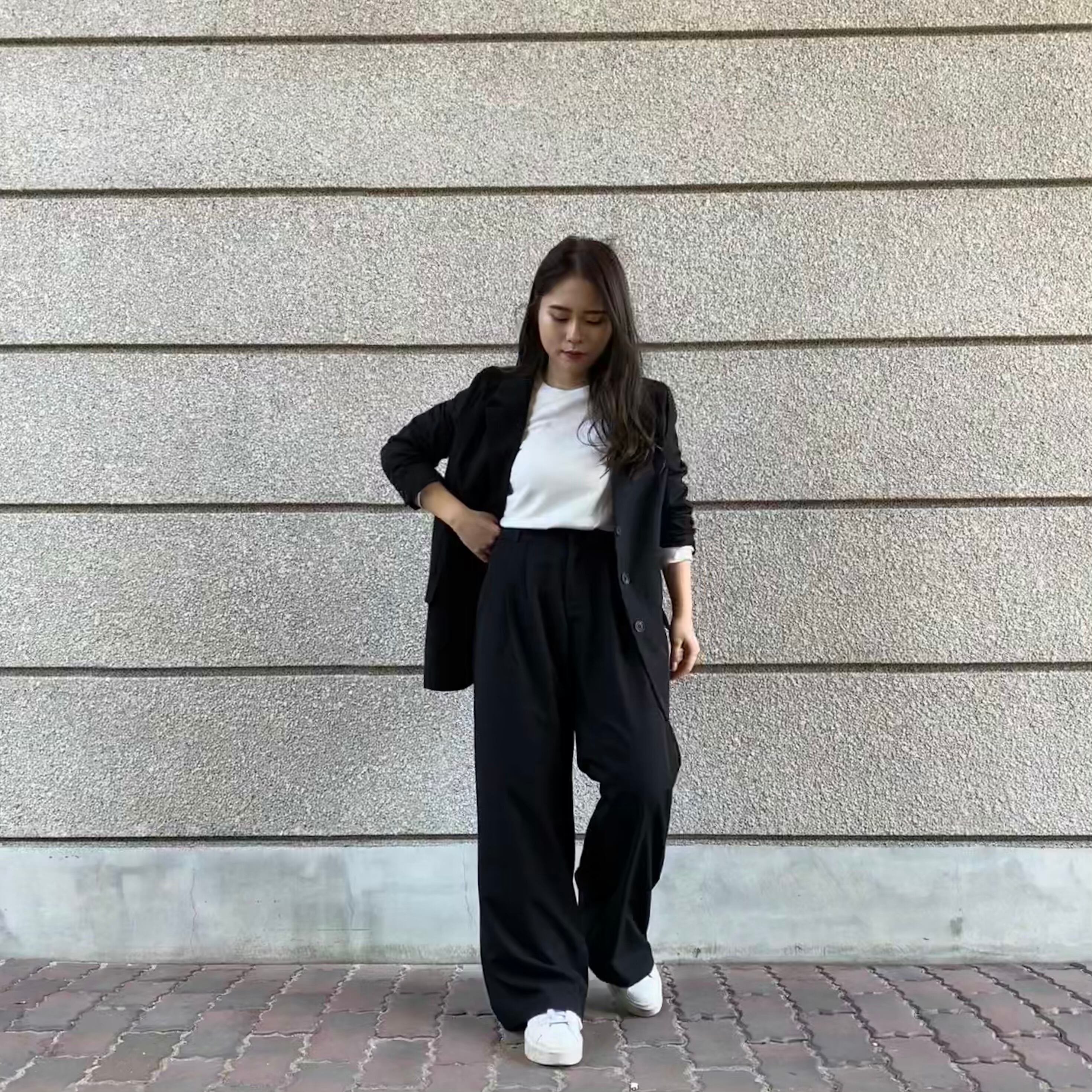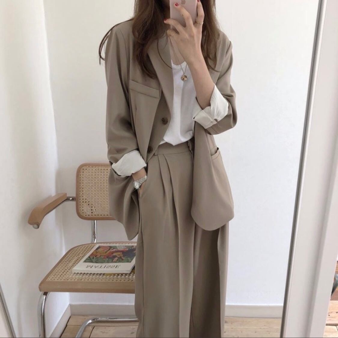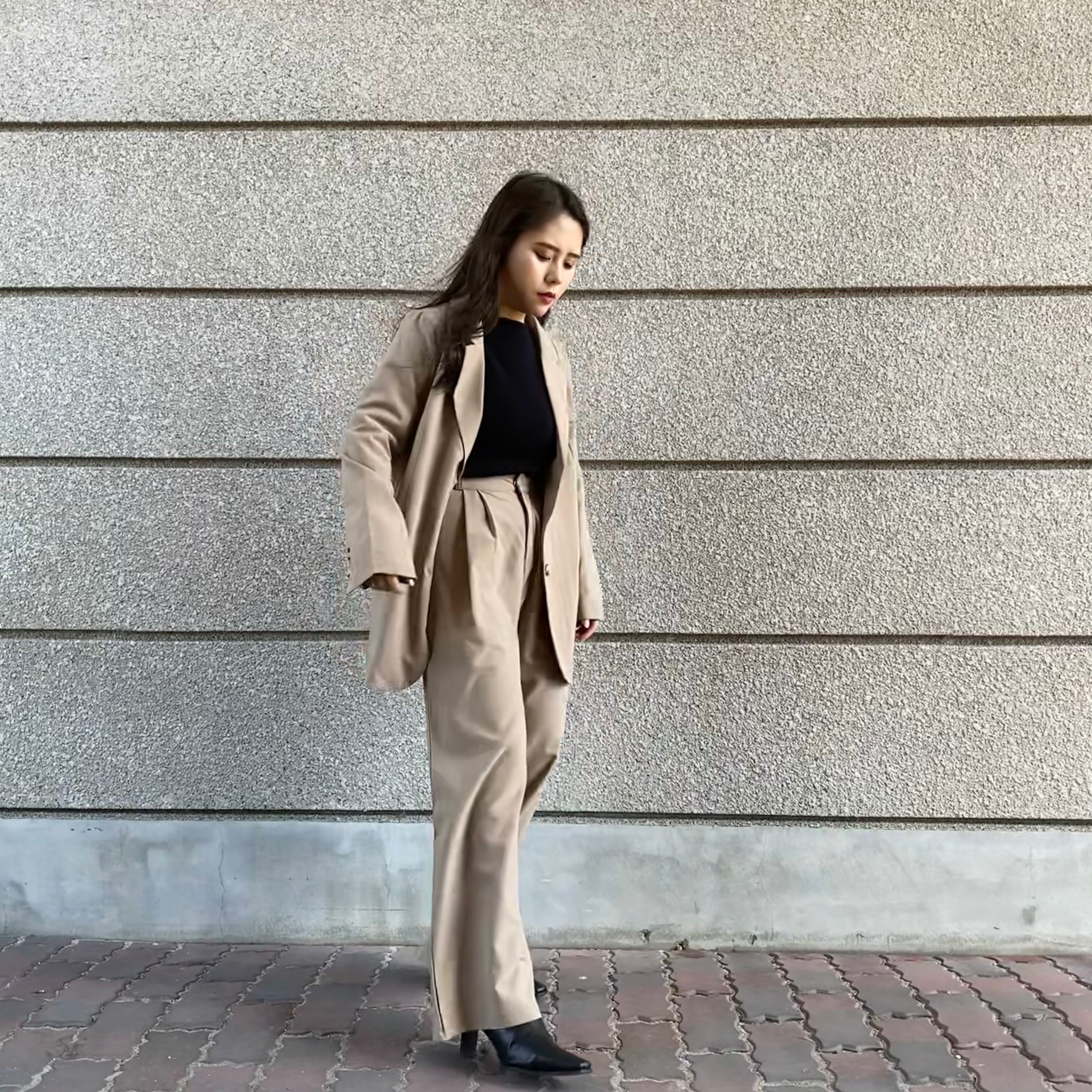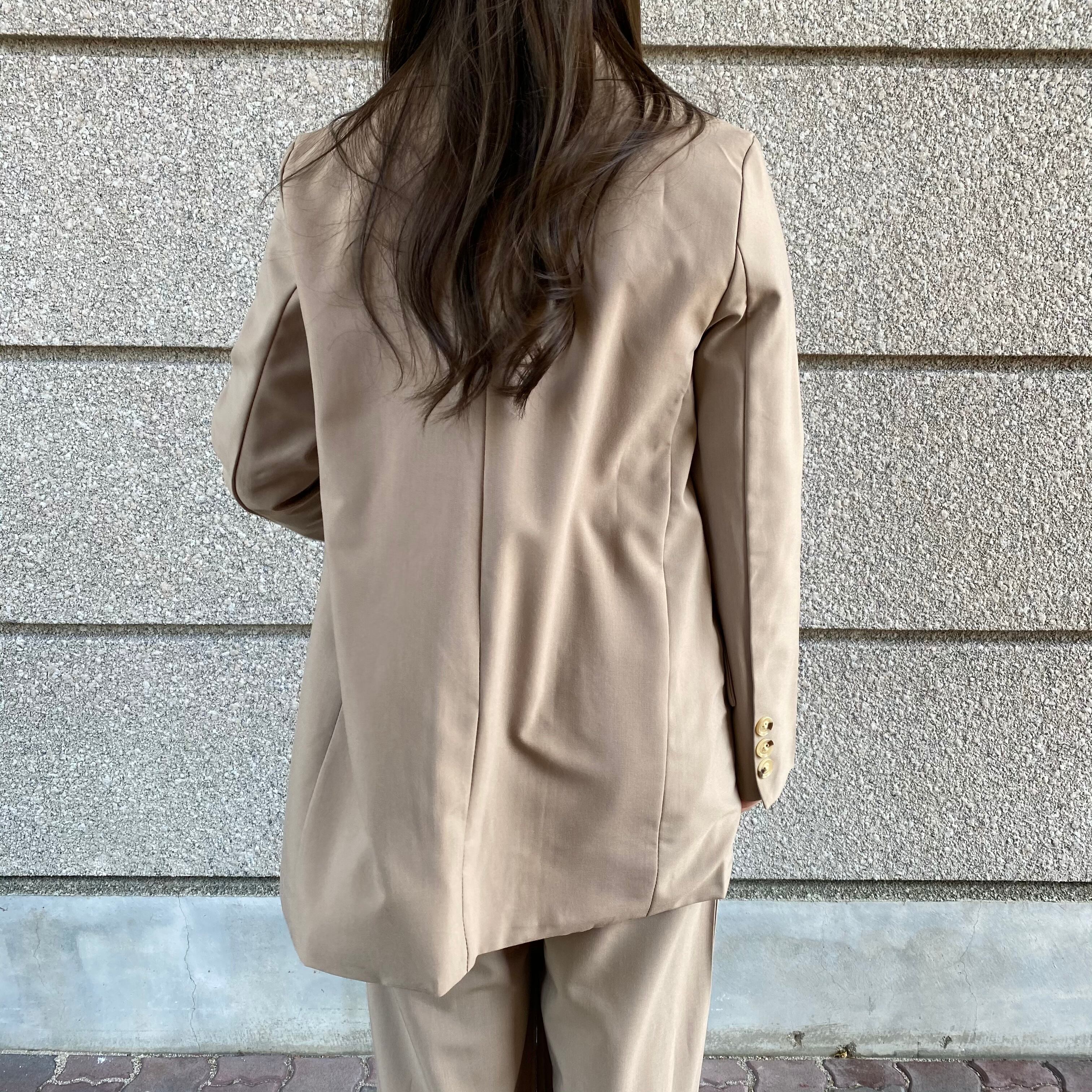 Color / black , beige Size / free <ジャケット> 着丈 71 身幅 92 肩幅 40 袖丈 54 <パンツ> ウエスト 66 ヒップ 94 股上 30 股下 69 *平置き寸法のため若干の誤差があります。 *7.5cmヒールを着用しております。 別々でも使用していただける 万能セットアップになります。 トップスは少し分厚めの物でもスッキリ着ていただけます。