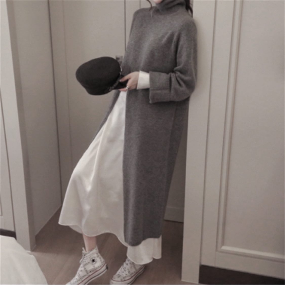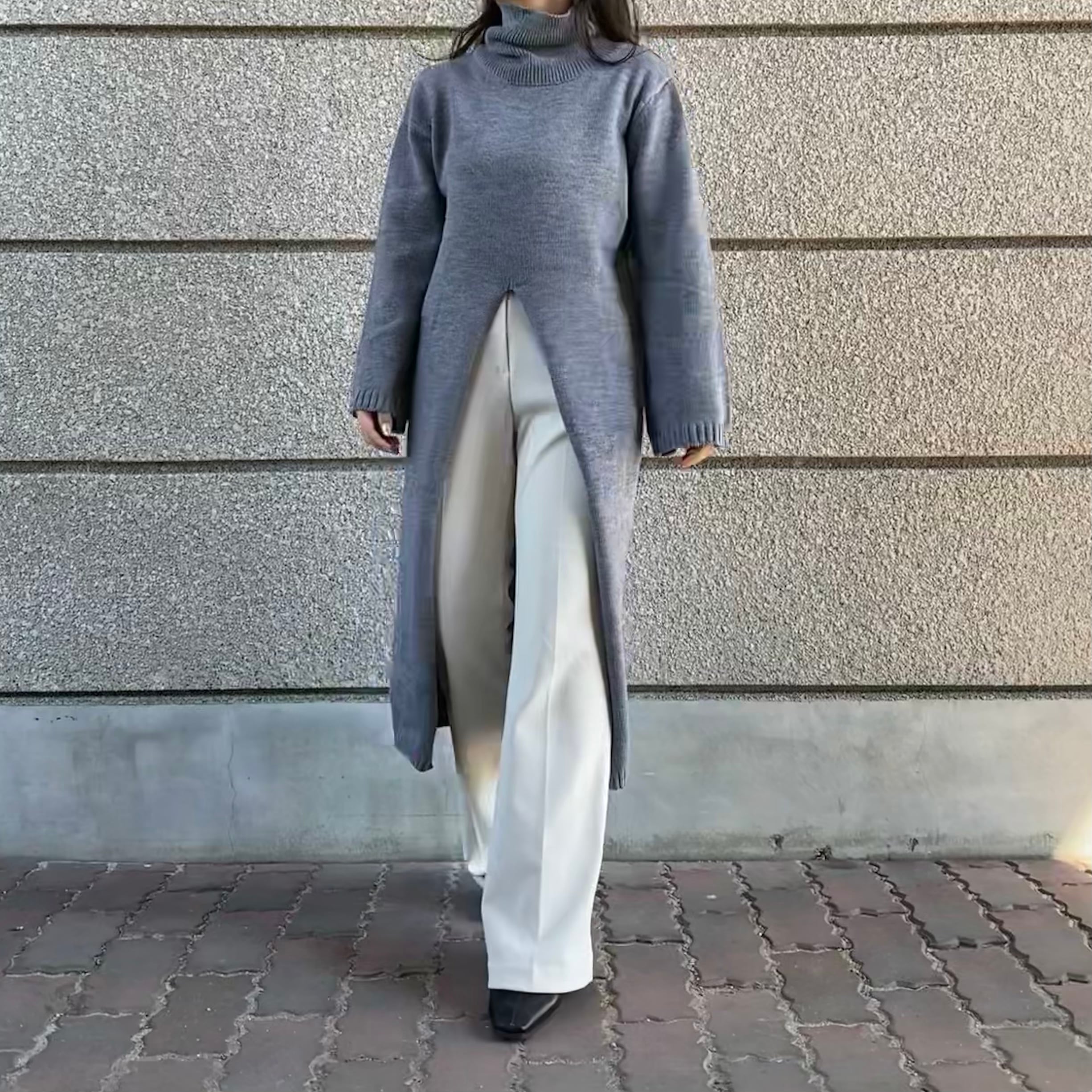 Color / black , grey Size / free 着丈 106 バスト 104 肩幅 42 袖丈 51 *平置き寸法のため若干の誤差があります。 モデル身長148cm センターに深めに入っているスリットで ロング丈ですがスッキリ魅せてくれるアイテムです。