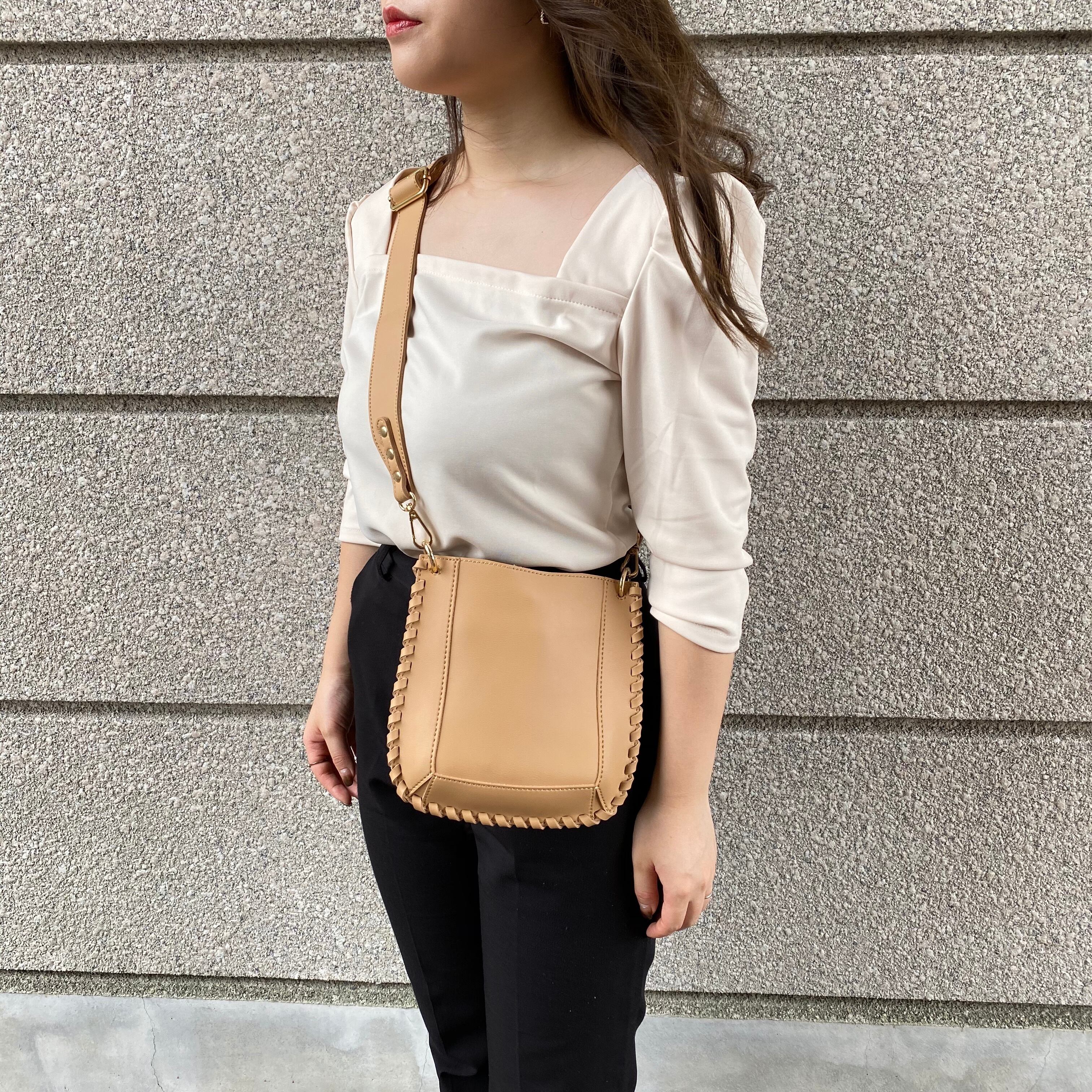 Color / beige 縦 21 横 20 *ショルダー最長117㎝ *平置き寸法のため若干の誤差があります。 縁がレースアップになっており、 形もとてもかわいいアイテムです。