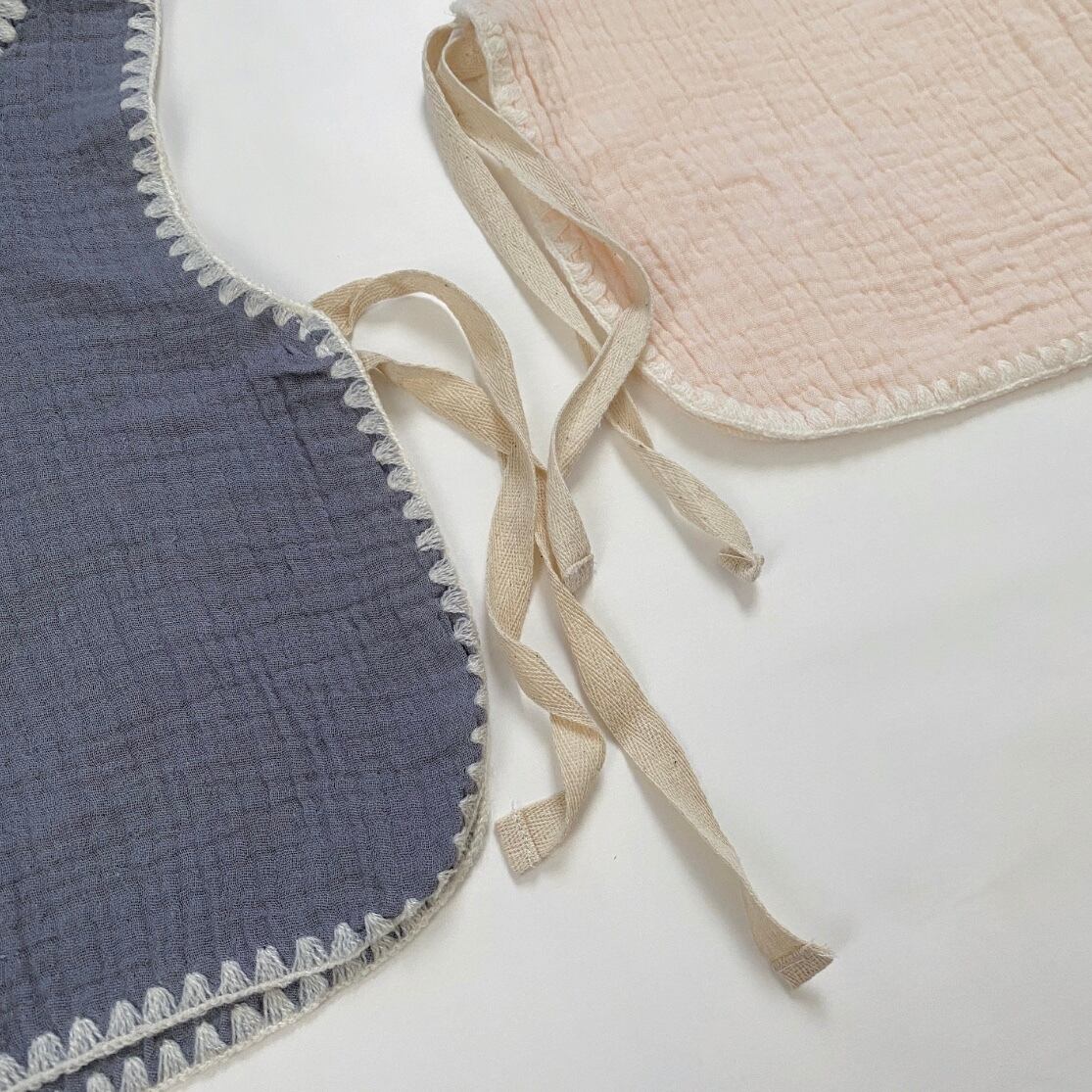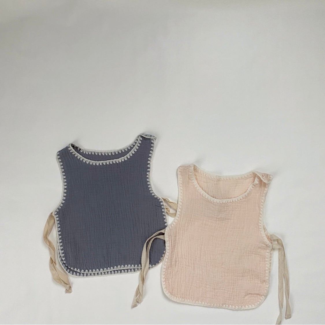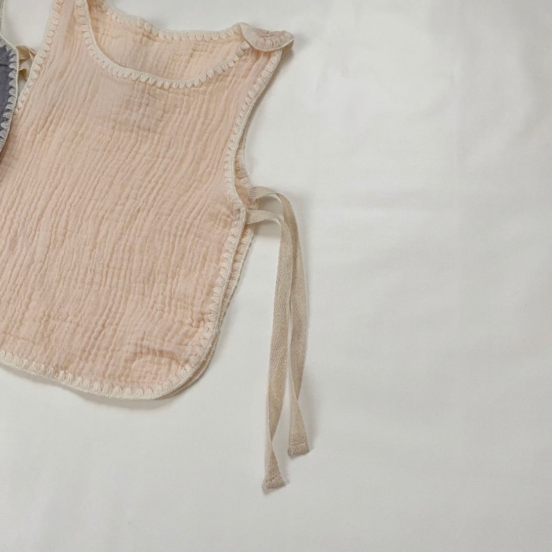 Color: gray / beige Size: one size (75〜80) 総丈 / 身幅 31/26 *平置き寸法のため若干の誤差があります。 スタイでもありベストでもあり 普段のお部屋着に これを付けるだけで お外用にも可愛く着られます。 柔らかい薄手のガーゼ生地に 刺繍ステッチがとっても可愛いです。 肩の片側にボタンが着いていて、 外さなくても頭からすっぽりと 着て頂けます。 サイドは紐になっているので かわいくむすんであげてください。