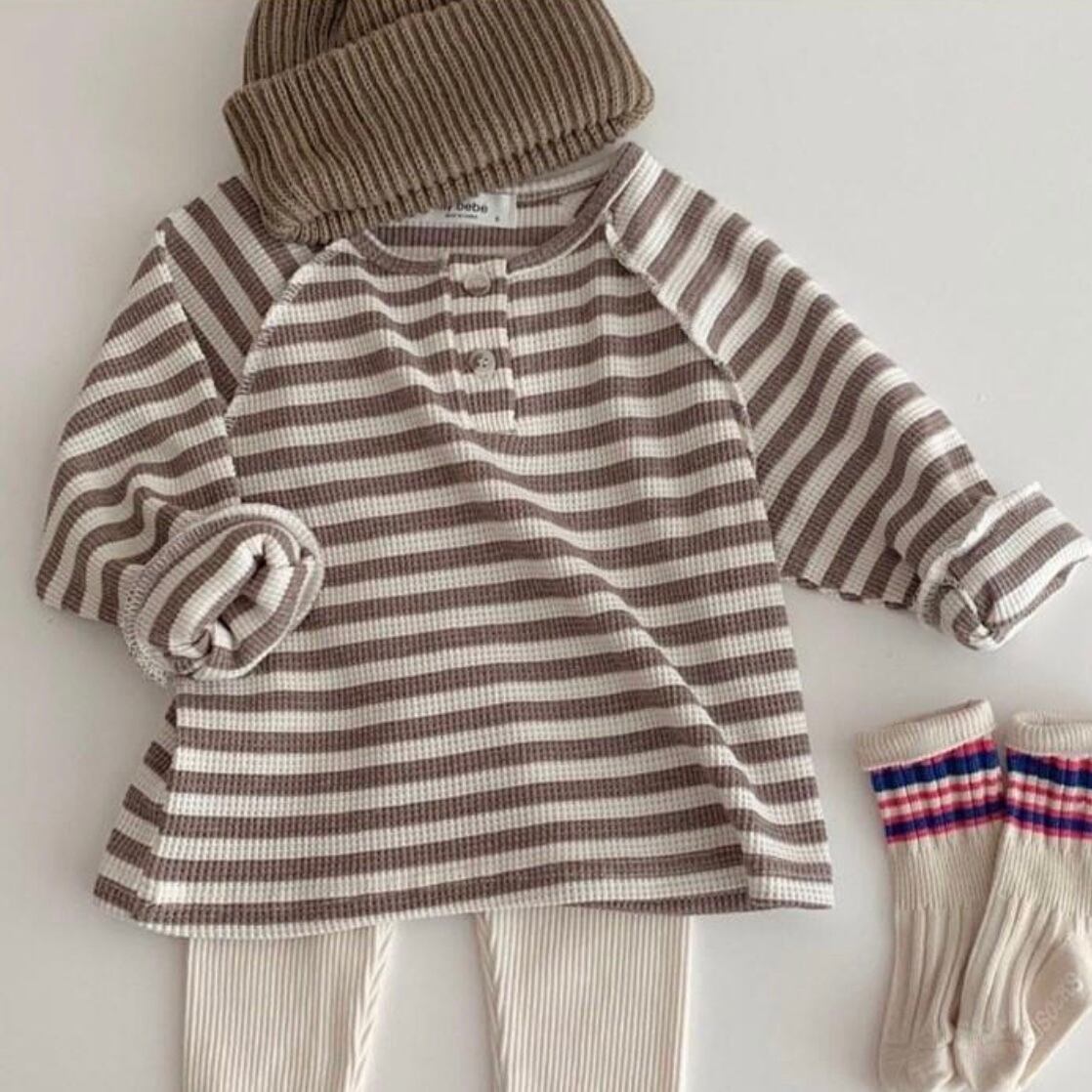 Color / border brown / ivory Size / one size (80〜90) 総丈 / 身幅 / 袖丈 36/33/37 *平置き寸法のため若干の誤差があります。 ロンTが活躍する季節がやってきましたね。 こちらはワッフル生地になっており、 ユニセックスで着ていただけます。