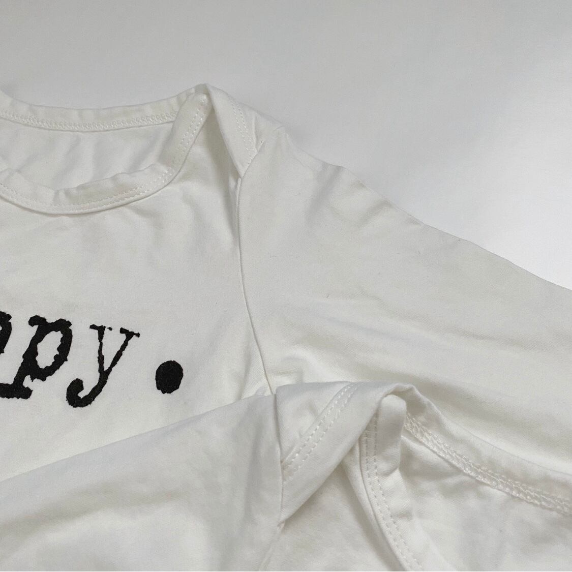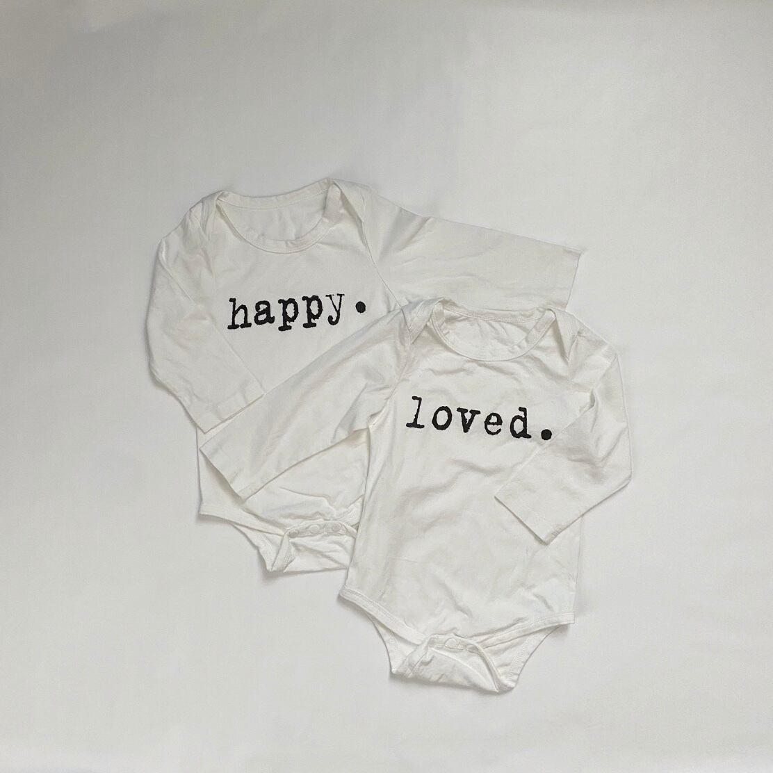 白地に happy. , loved. のロゴがプリントされたロンパースになります。