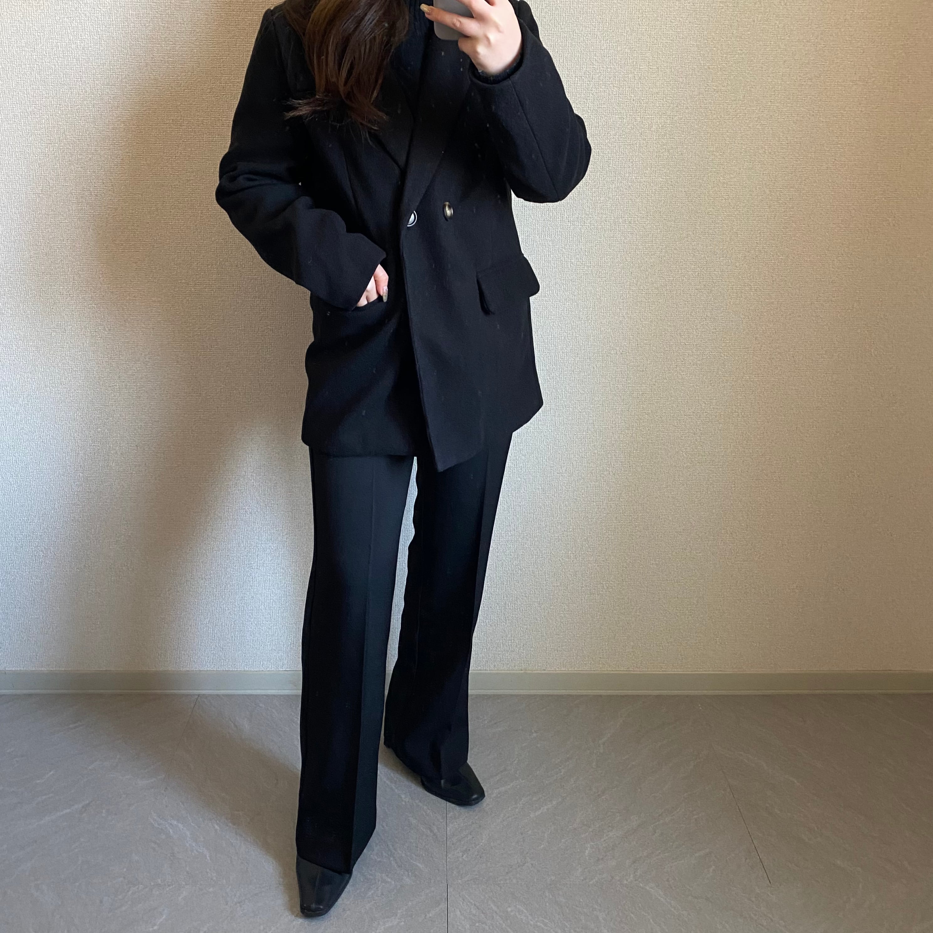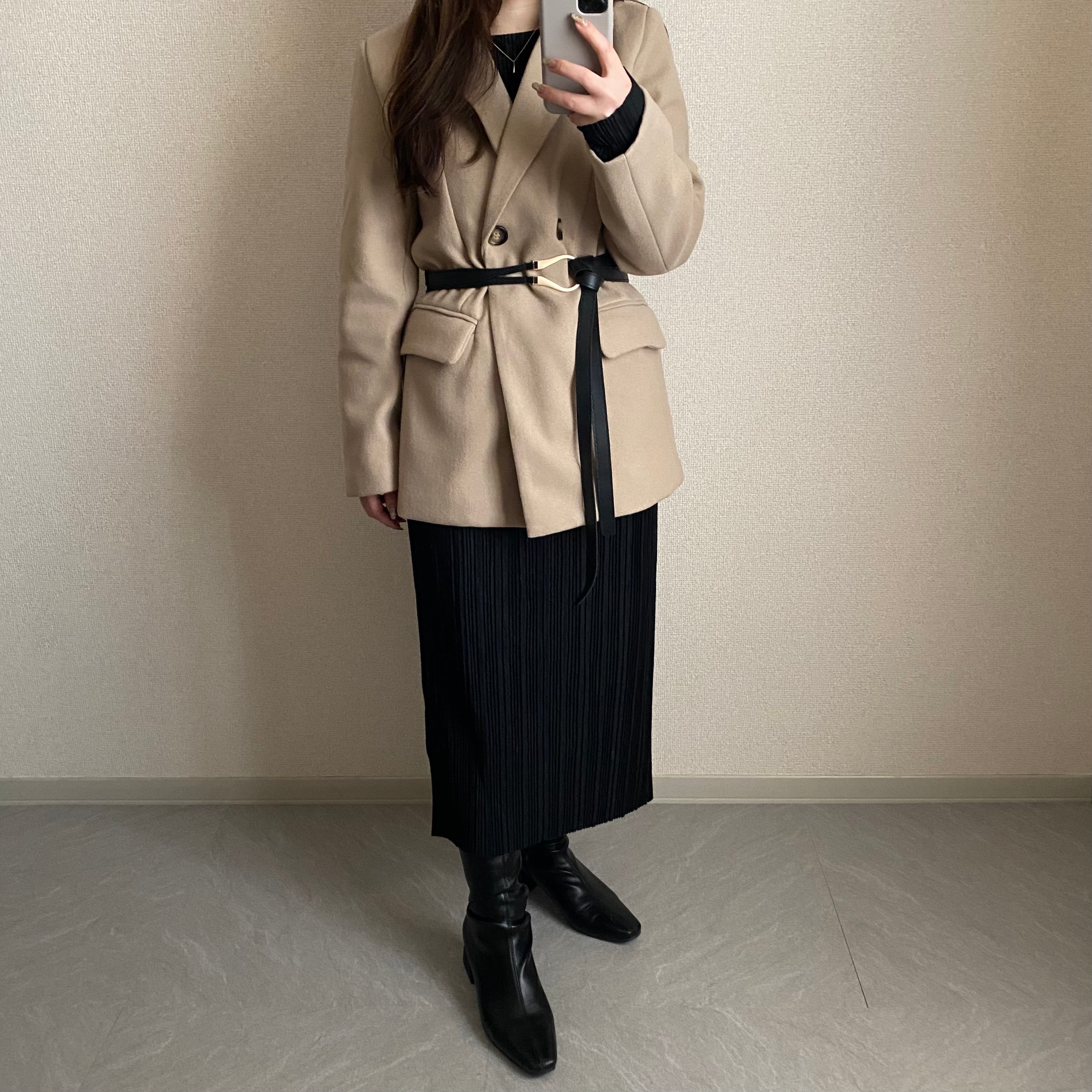 Color / black , beige Size / free 着丈 72 バスト 98 肩幅 39 袖丈 57.5 ベルト長さ 123 *平置き寸法のため若干の誤差があります。 モデル身長148cm 存在感のある、 ストラップベルトが付属した フロントボタンジャケット。 とても華奢見えさせてくれるアイテムです。