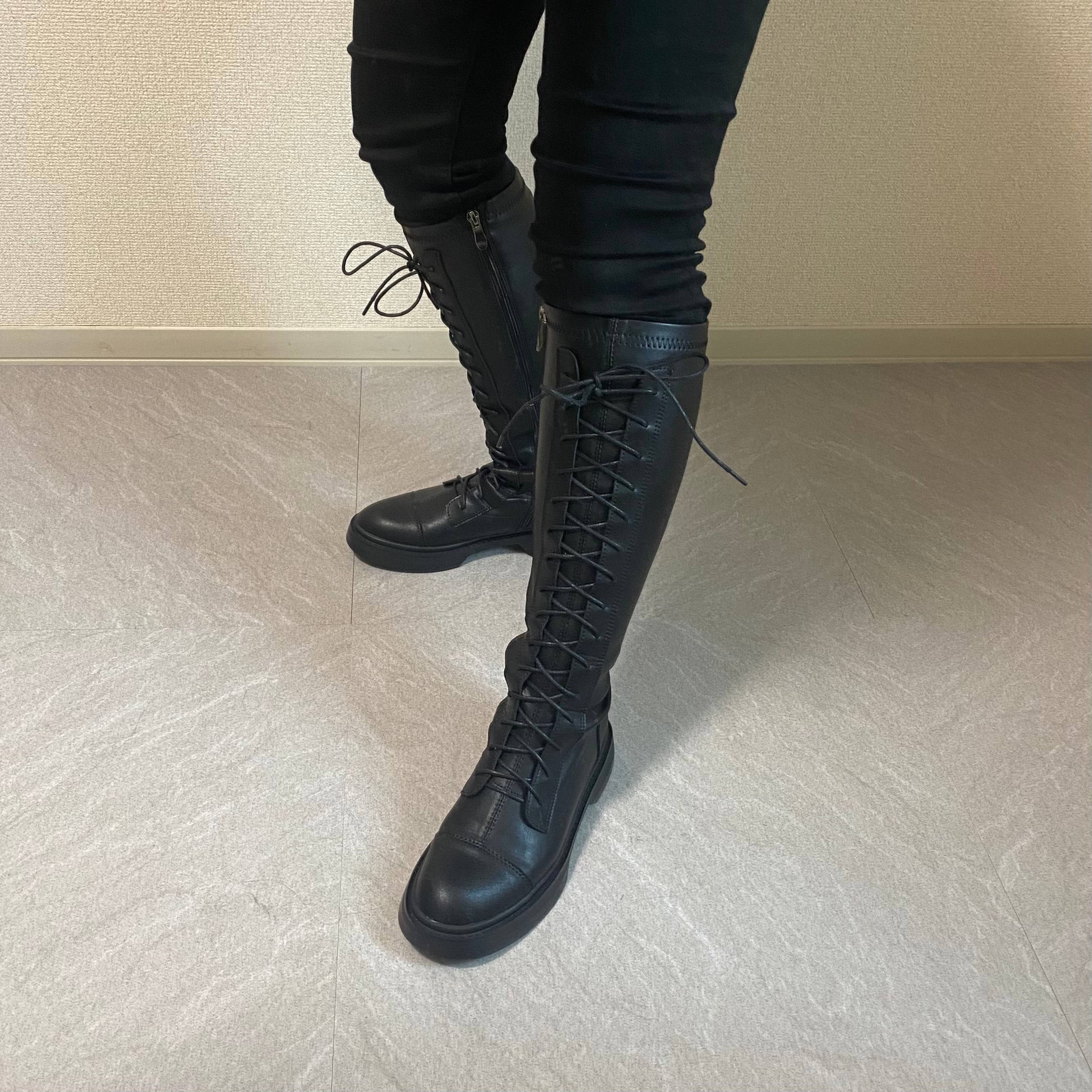 Color / black Size / S (23.0〜23.5) M(23.5〜24.0) L(24.0〜24.5) ヒール 3 甲幅 8 長さ(ヒールなし) 38 *測る位置により若干の誤差が生じる場合がございます。 内側ファスナー付きの ベーシックなレースアップブーツ。 伸縮性があるので、コンプレックスをお持ちの方でも楽々履いていただけます◎