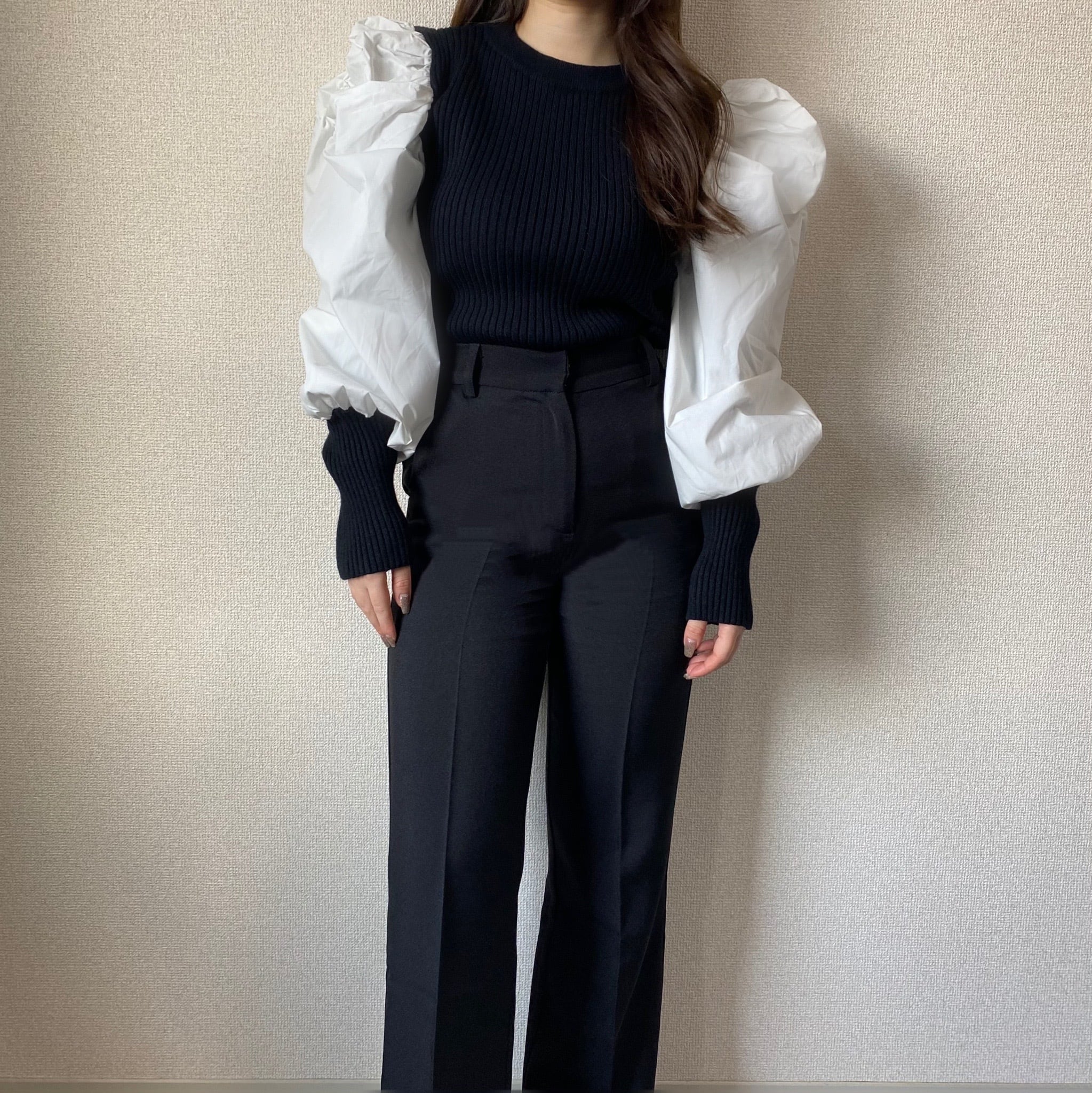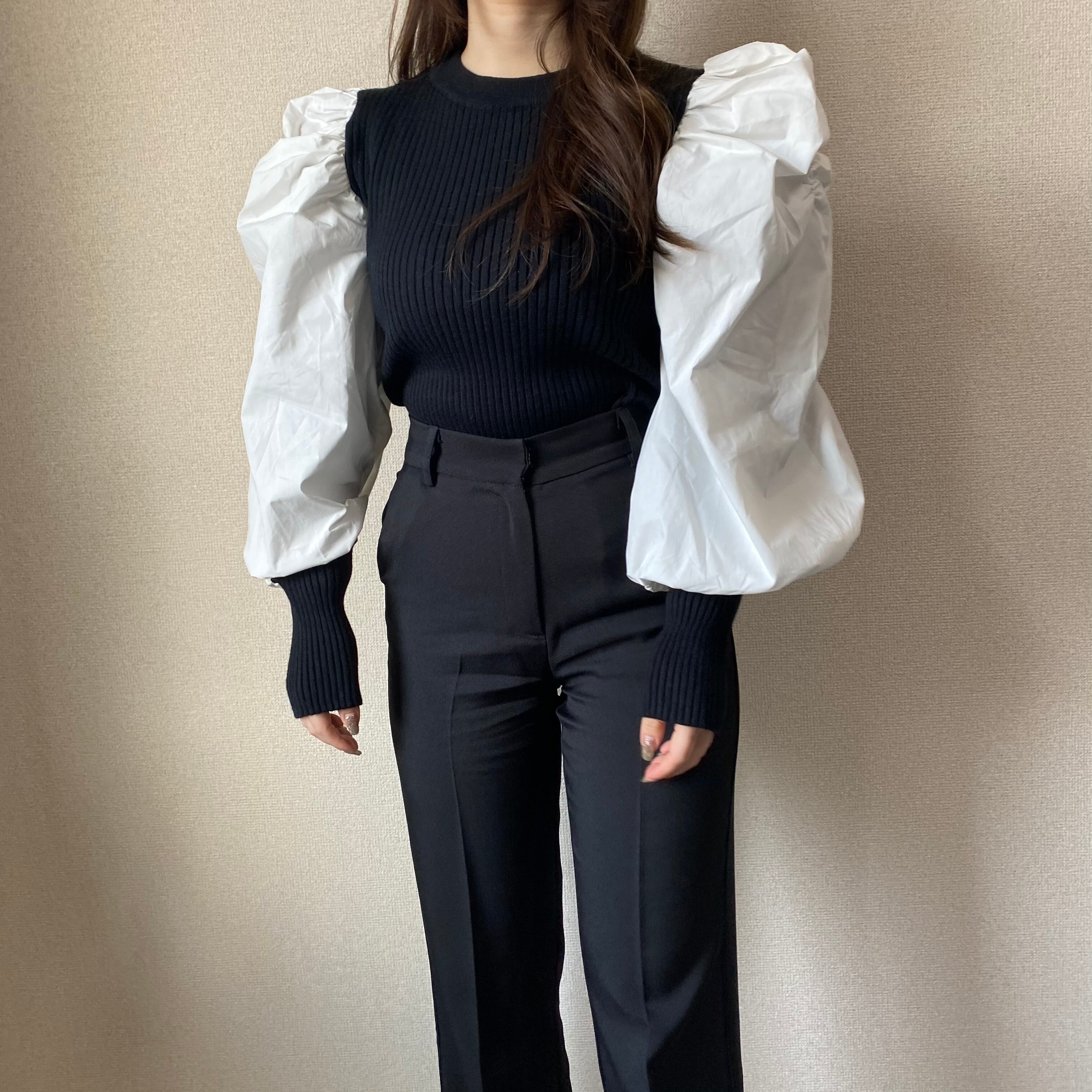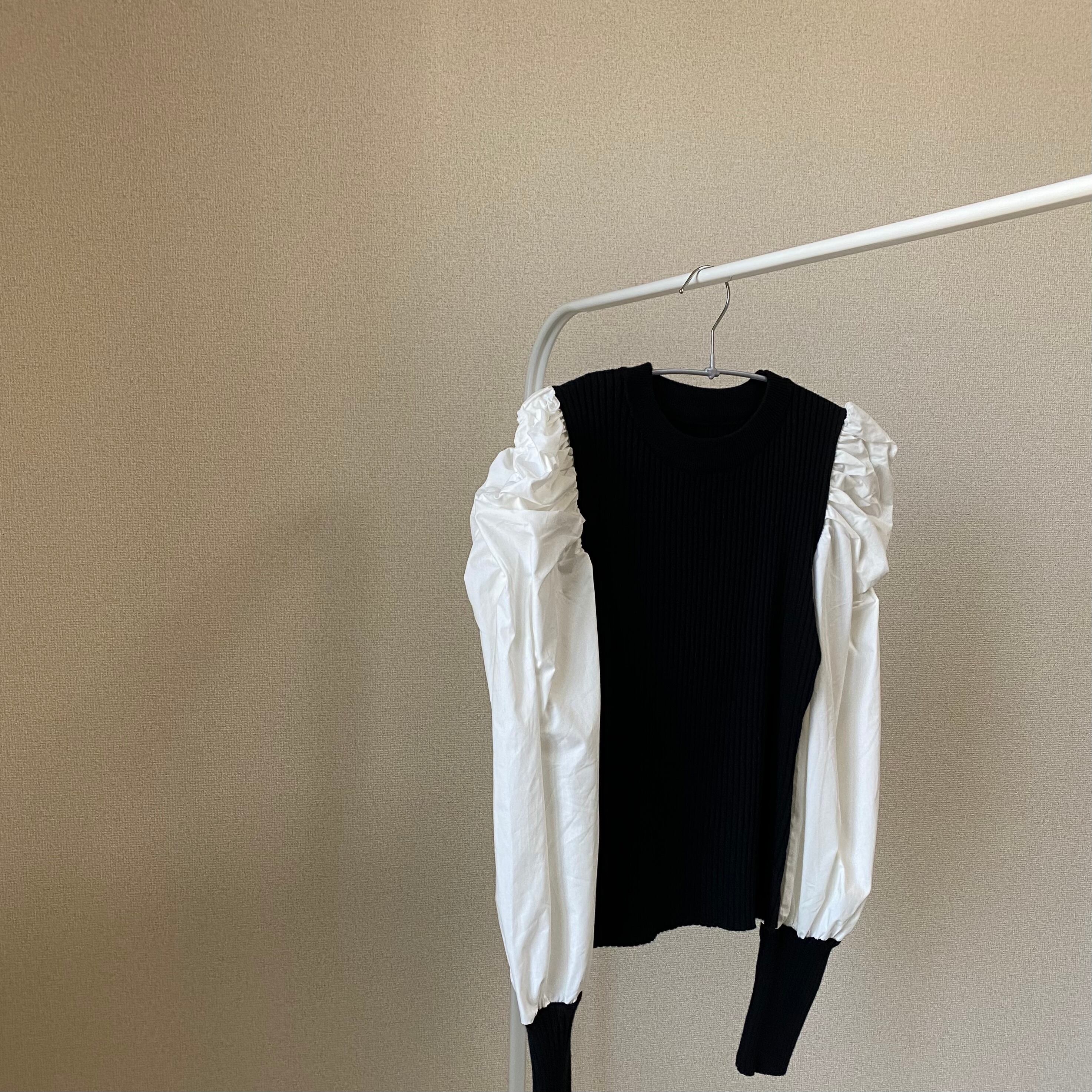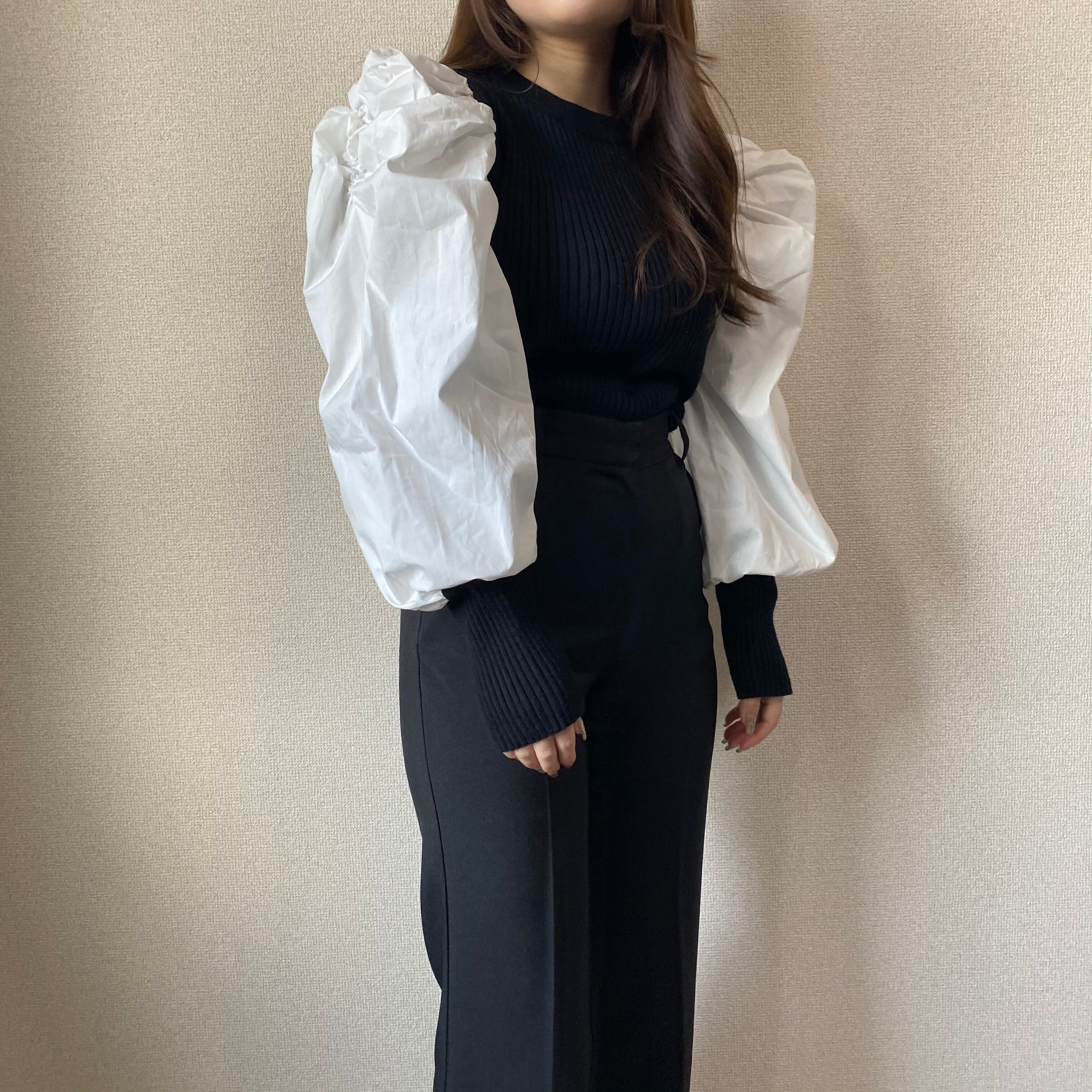 Color / black Size / free 着丈 55 バスト 73 肩幅 34 袖丈 66 *平置き寸法のため若干の誤差があります。 モデル身長148cm シャーリングでたっぷりのボリューム、肉厚ニット、しっかりとした立ち上がりのあるお袖がポイントのドッキングニット。 華やかに見せてくれる一枚。