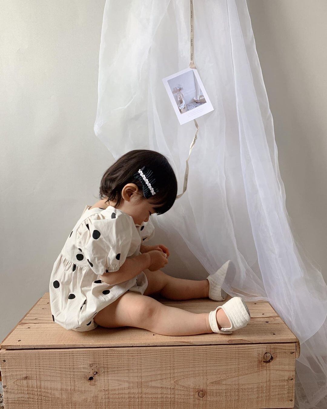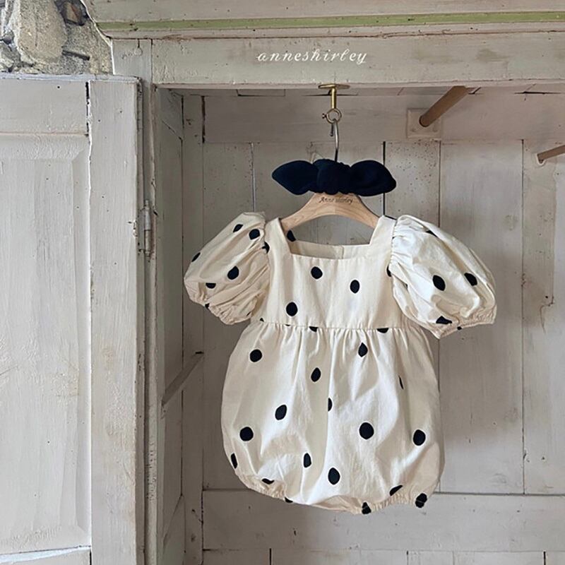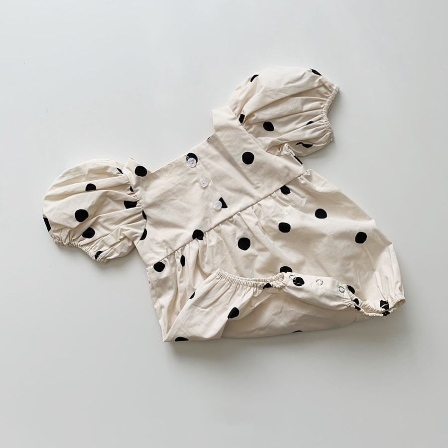 Color / ivory Size / free 総丈 / 身幅 / 袖丈 47 / 29.5 / 18 リボンヘアバンド付きの水玉ロンパース。 お袖がふんわりとしてとても可愛らしい、ギフトにもおすすめの一着です。