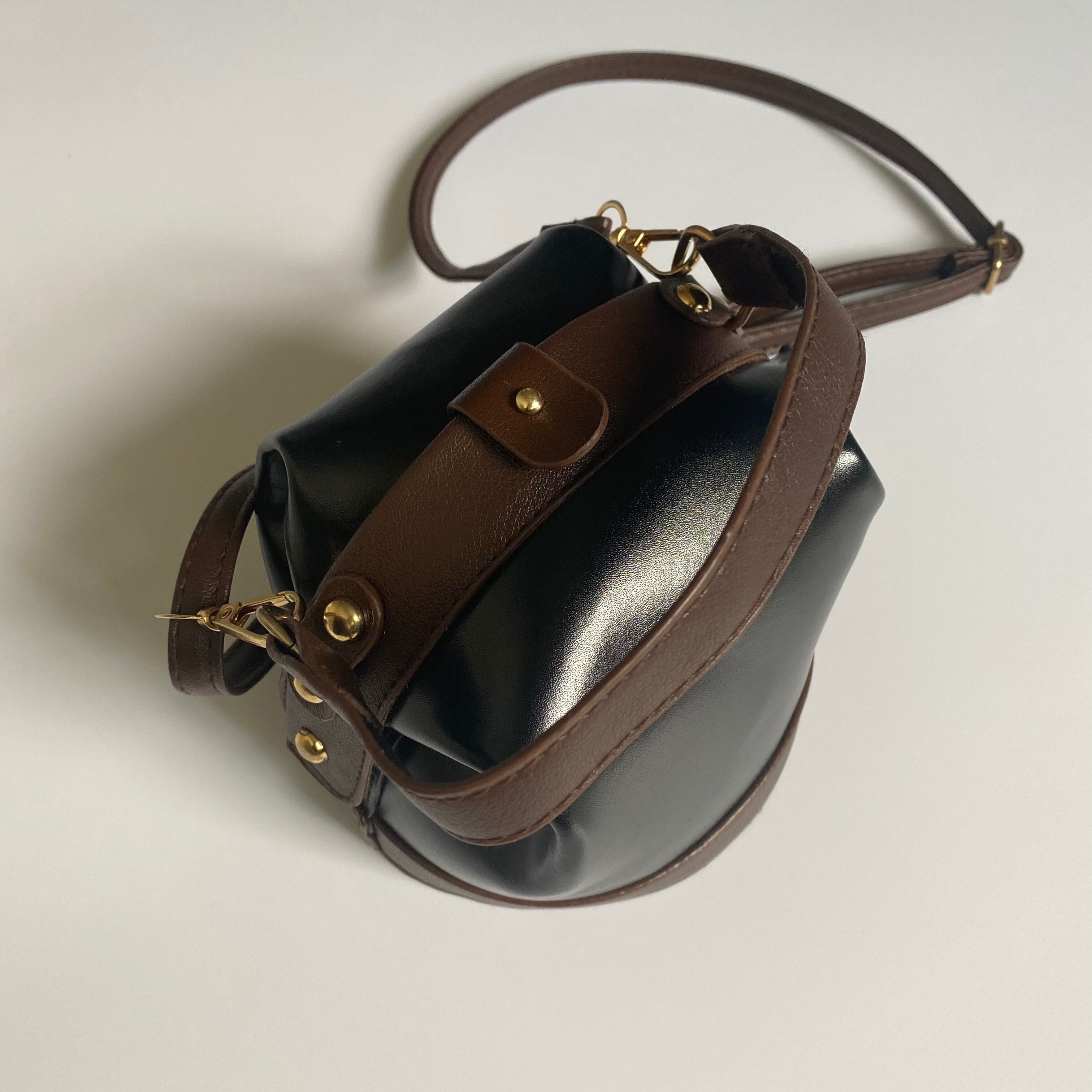 Color / black × brown Size / 開け口 14 マチ 14 直径 13 ストラップ 117 ころんとしたシルエットがとても上品なこちらのアイテムは、 ゴールドの金具がデザインのワンポイントに。 ショルダー付きなので、ハンドバッグにも肩掛けにも2wayで使っていただけます。