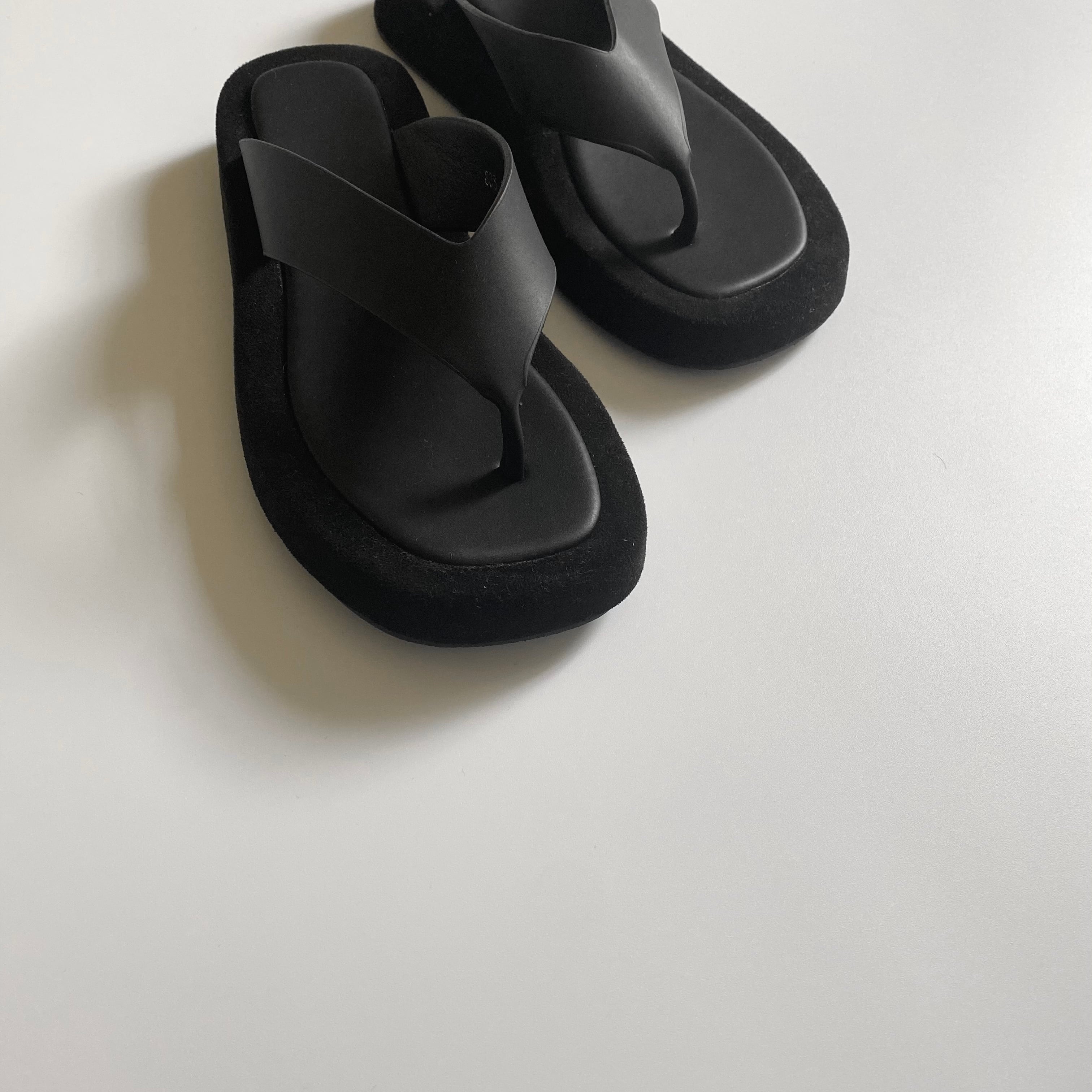 Color / black Size / S (23.0〜23.5) M(23.5〜24.0) L(24.0〜24.5) 甲幅 8〜10 高さ 3.5 *測る位置により若干の誤差が生じる場合がございます。 今季流行りのスエードソールのフリップフロップサンダル。 意外と使える万能アイテムで、 履いた時に見えるスエードが抜け感があり、とても可愛いアイテム。