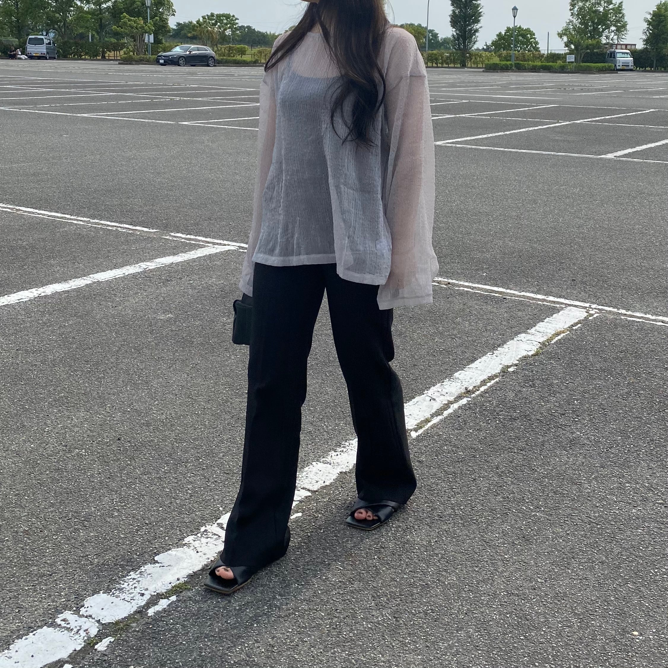 Color / black , gray Size / free 着丈 65 バスト 57 肩幅 50 袖丈 54.5 *平置き寸法のため若干の誤差があります。 モデル身長 148cm (3枚目〜) 背中がサークル状に開いたポイントのある シアートップス。 サークルの大きさは紐で調節が可能です。 去年に続き今年もシアー素材が人気ということで Tlifeでは一癖あるシアートップスを展開。