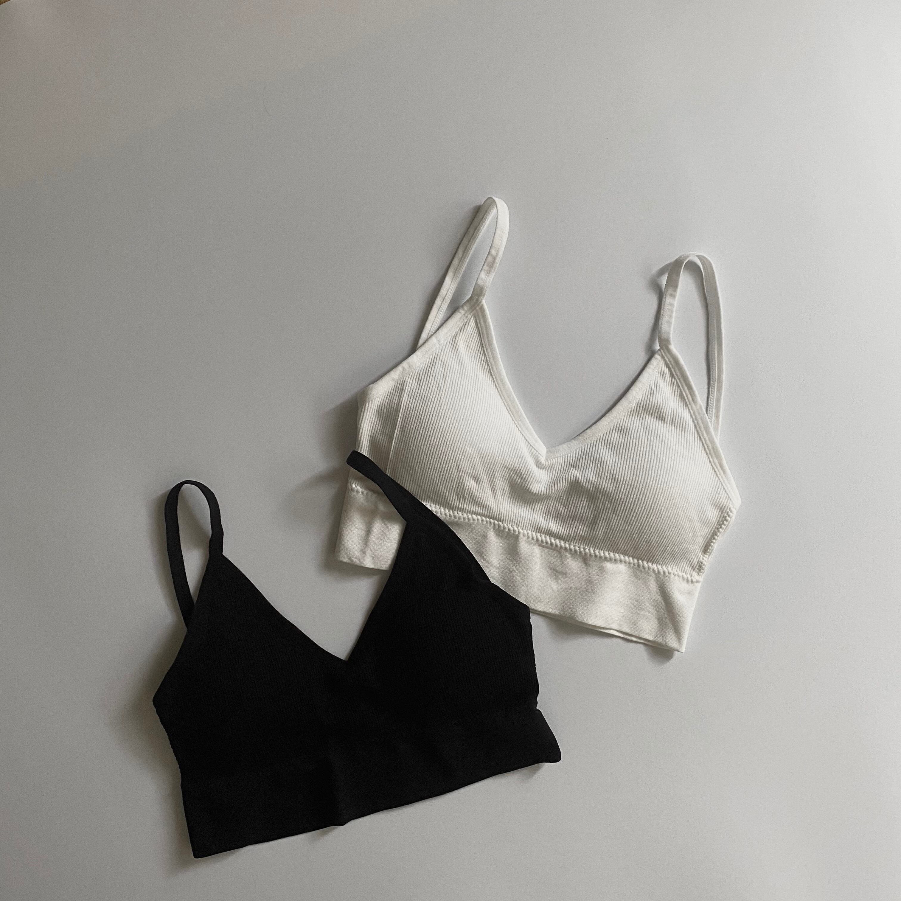 Color / black , white Size / free 肩紐含丈 29 身幅 30.5 Max 37 *平置き寸法のため若干の誤差があります。 華奢な肩紐のリブ素材のブラトップを black & white の2点セットでご用意。 アンダー周りは伸縮性のある生地感で、 カップの取り外し可能です。 バックオープンのお洋服のインナー問題を解決してくれるかなり優秀なアイテム。 ※ホールド力やキープ力のあるものではございませんのでご了承くださいませ。