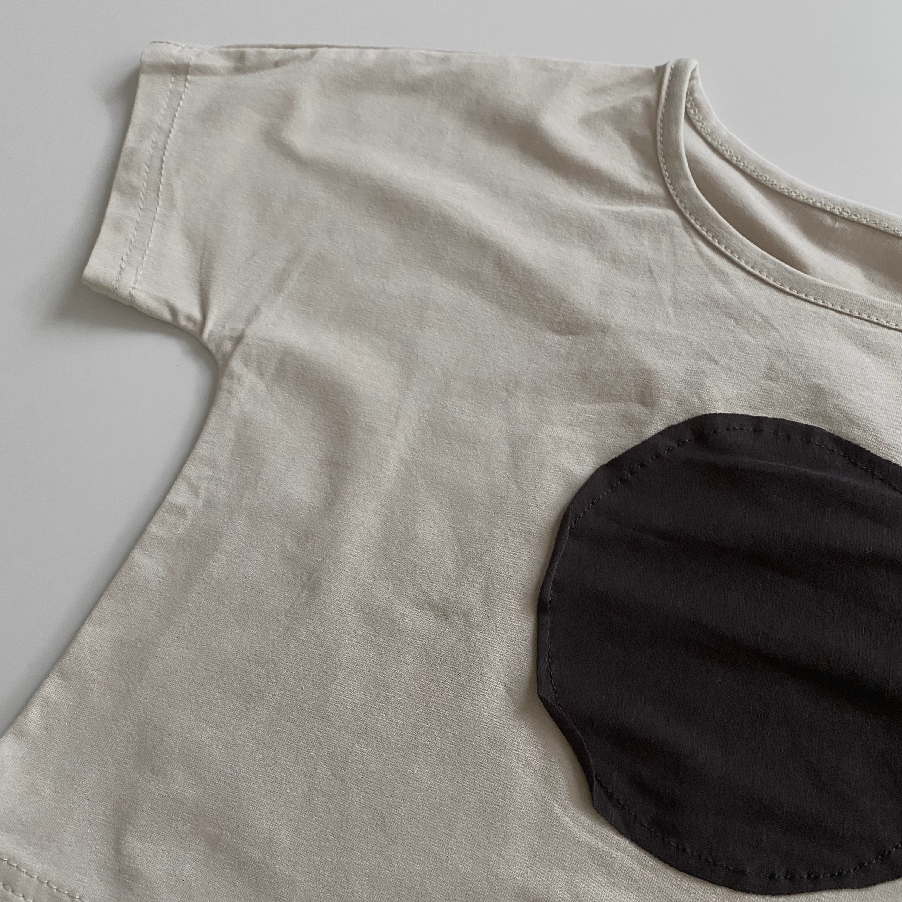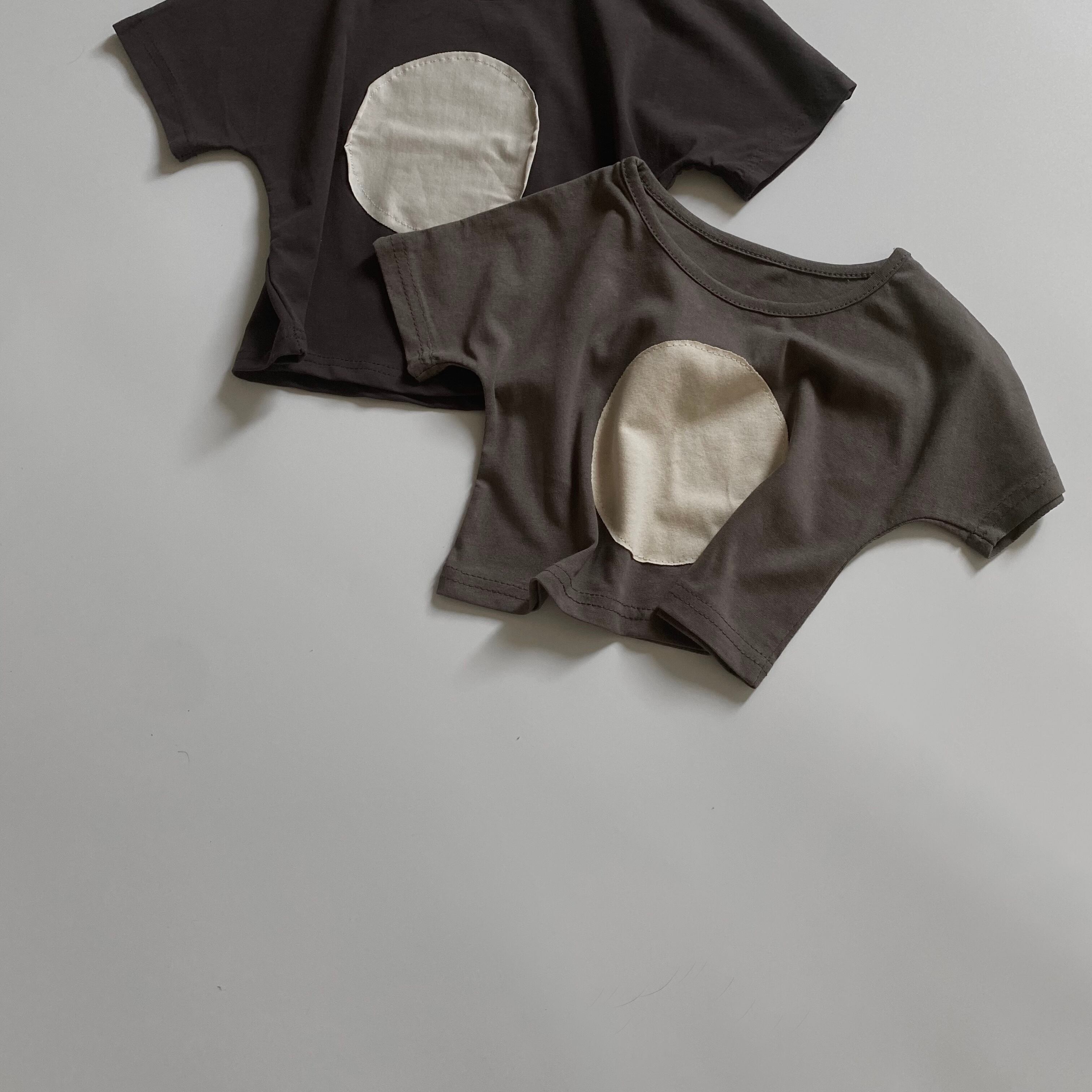 Color / greige , gray , charcoal gray Size / S(80〜90) M(90〜100) 総丈 / 身幅 / 襟ぐりからの袖丈 S 29 / 32 / 17.5 M 36 / 35 / 19 *平置き寸法のため若干の誤差があります。 フロントの○がポイントの可愛らしいTシャツ。 S gray M charcoal gray サイズで色味が異なります。