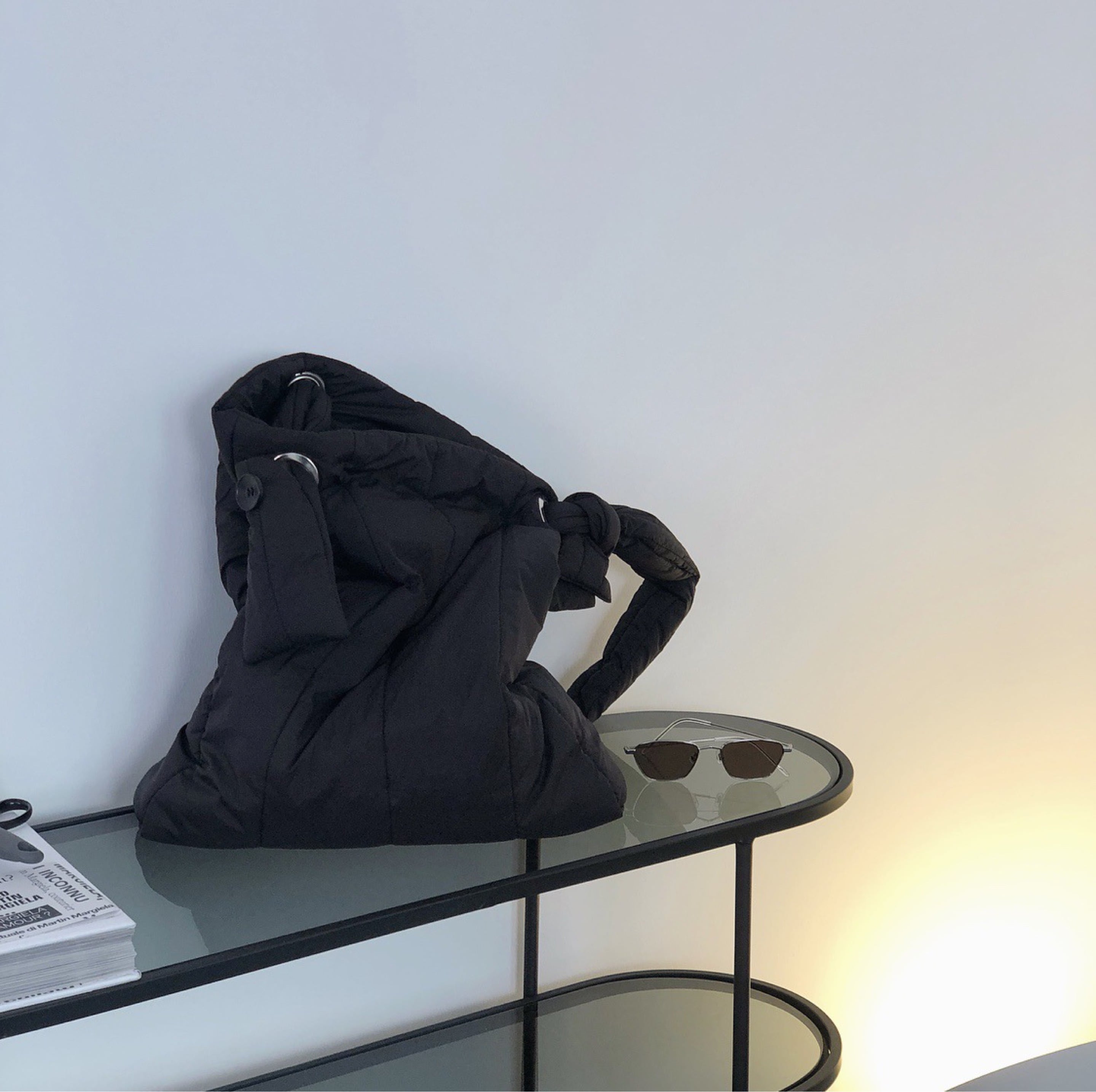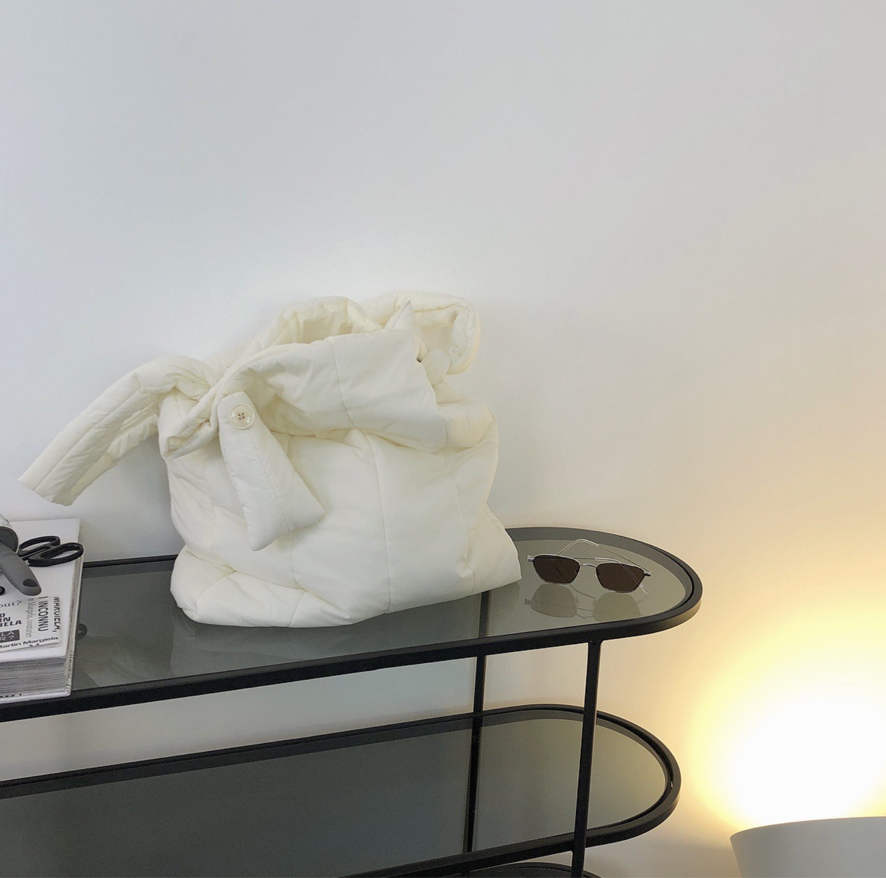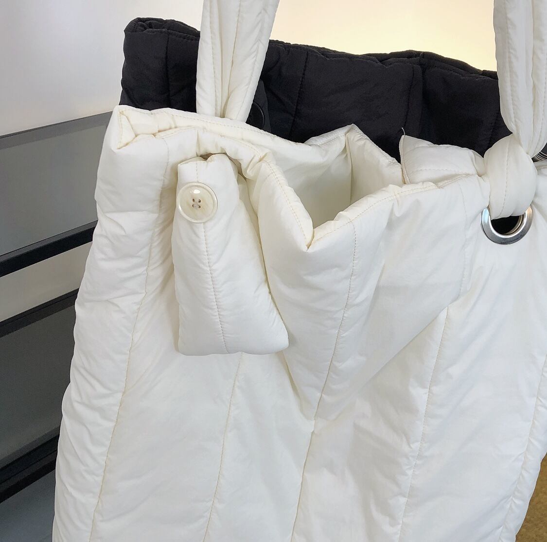 Color / black , ivory Size / one size 高さ 51 幅 42 マチ 7.5 *平置き寸法のため若干の誤差があります。 珍しい中綿素材のショルダーバック。 程良く肉厚のボリューム、大きめサイズのスクエアフォルムがコーデに抜け感を出してくれます。 中には大きなポケットも付いております。 肩ベルトは自由に長さを調整できるので お好みに合わせた長さでお使いください◎