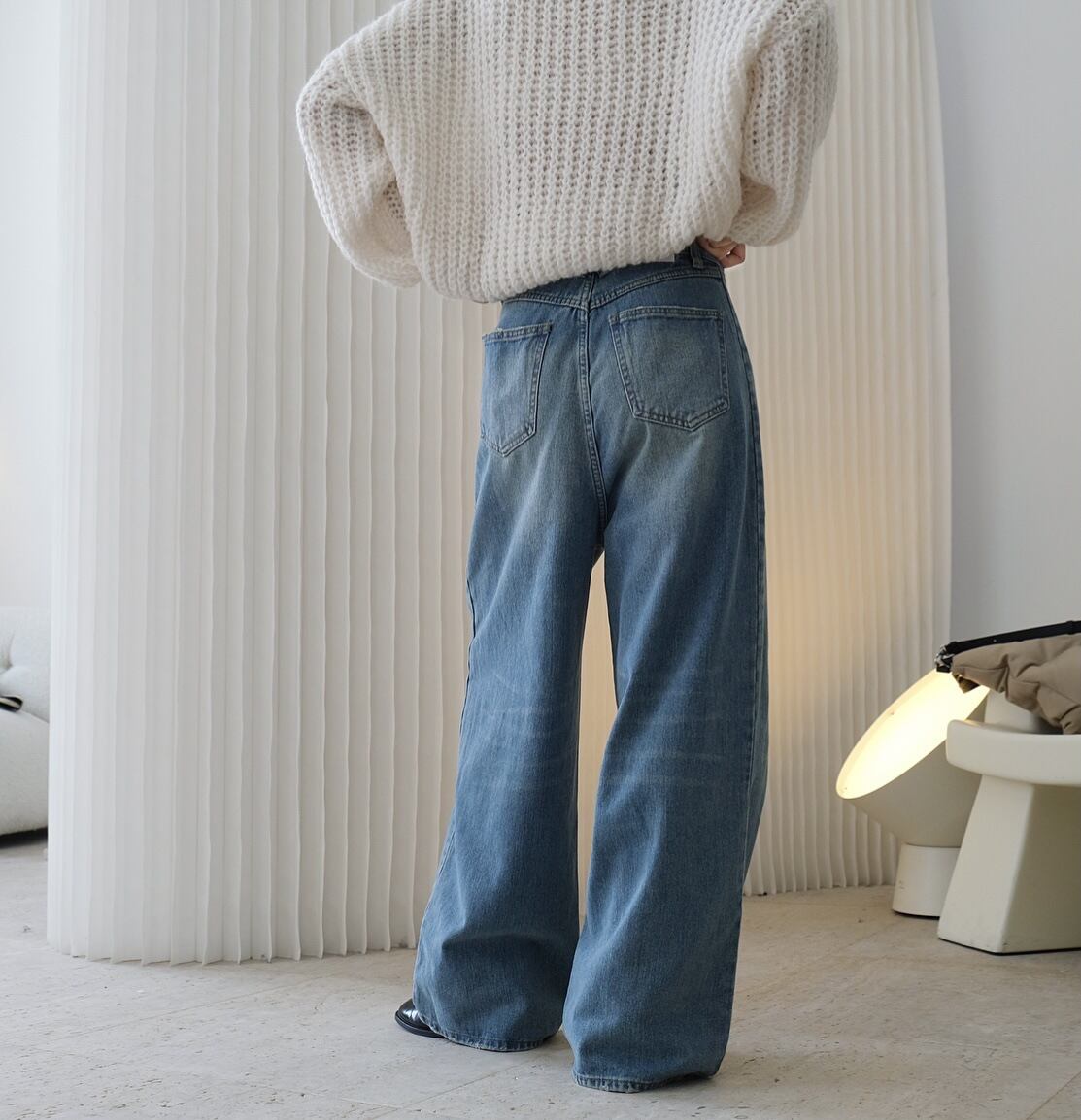Color / light blue Size / free 総丈 103 ウエスト 34 ヒップ 94 股上 38 股下 66 わたり幅 31 裾幅 27 *平置き寸法のため若干の誤差があります。 絶妙な色味のハイウエストワイドデニム。 少し落として腰履きでルーズに履いていただくのも◎ 裾など細かいところまで拘りの詰まったアイテム。