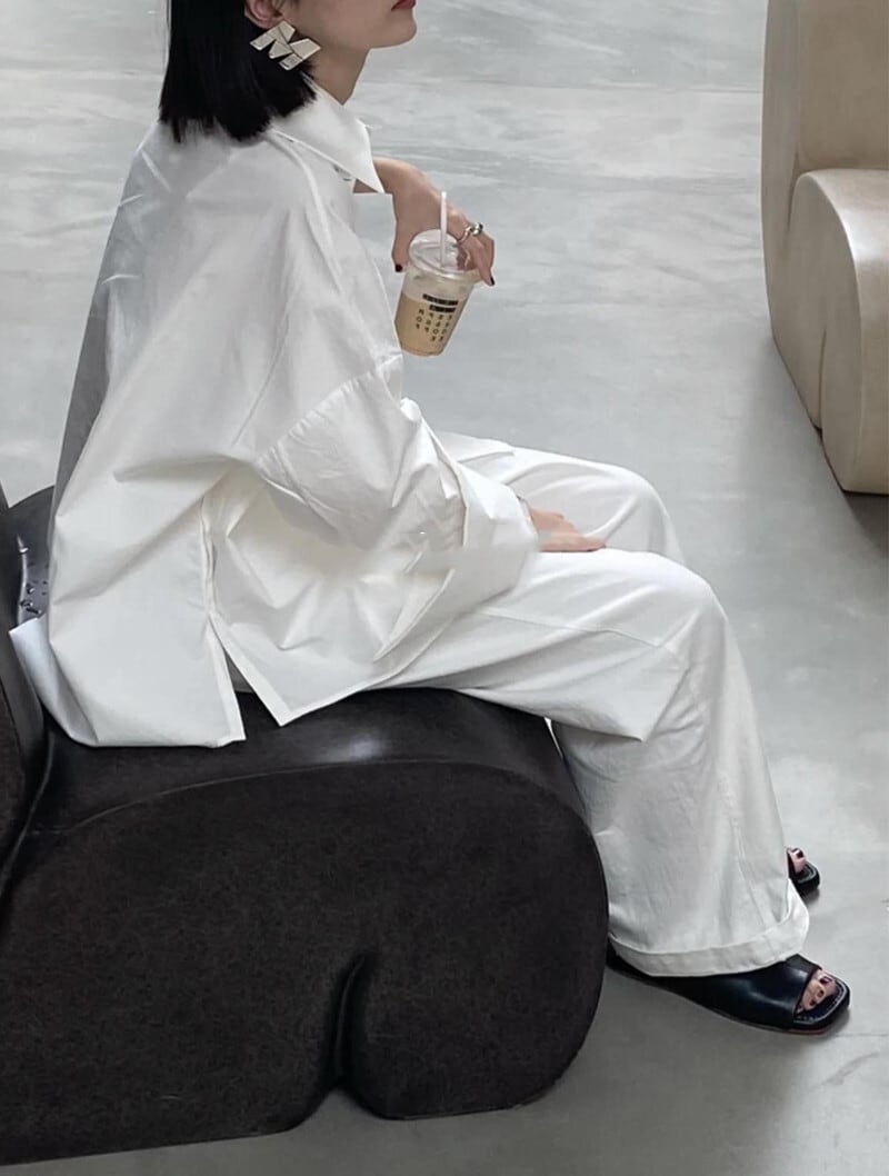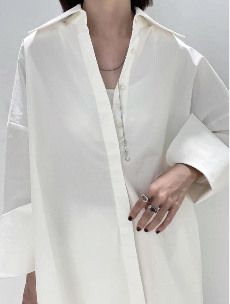 Color / white Size / free 着丈 77 身幅 70 肩幅 69 袖丈 44 *平置き寸法のため若干の誤差があります。 たっぷりと身幅が取られた 大人オーバーサイズシャツ。 大きな襟に長さのある袖口で クールにカッコよく決まるアイテム。 両サイドにスリットが入っており重たくならず スッキリ見せてくれます。
