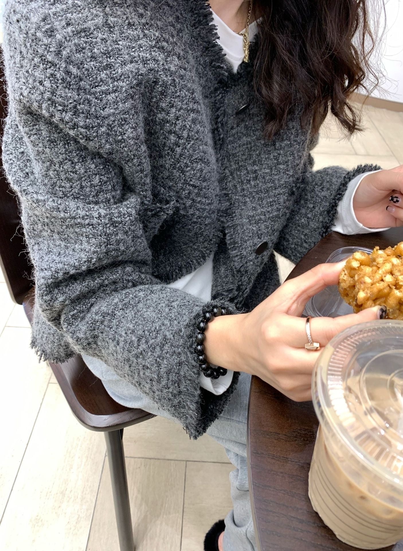 落ち着いたグレーのツイードジャケットです。